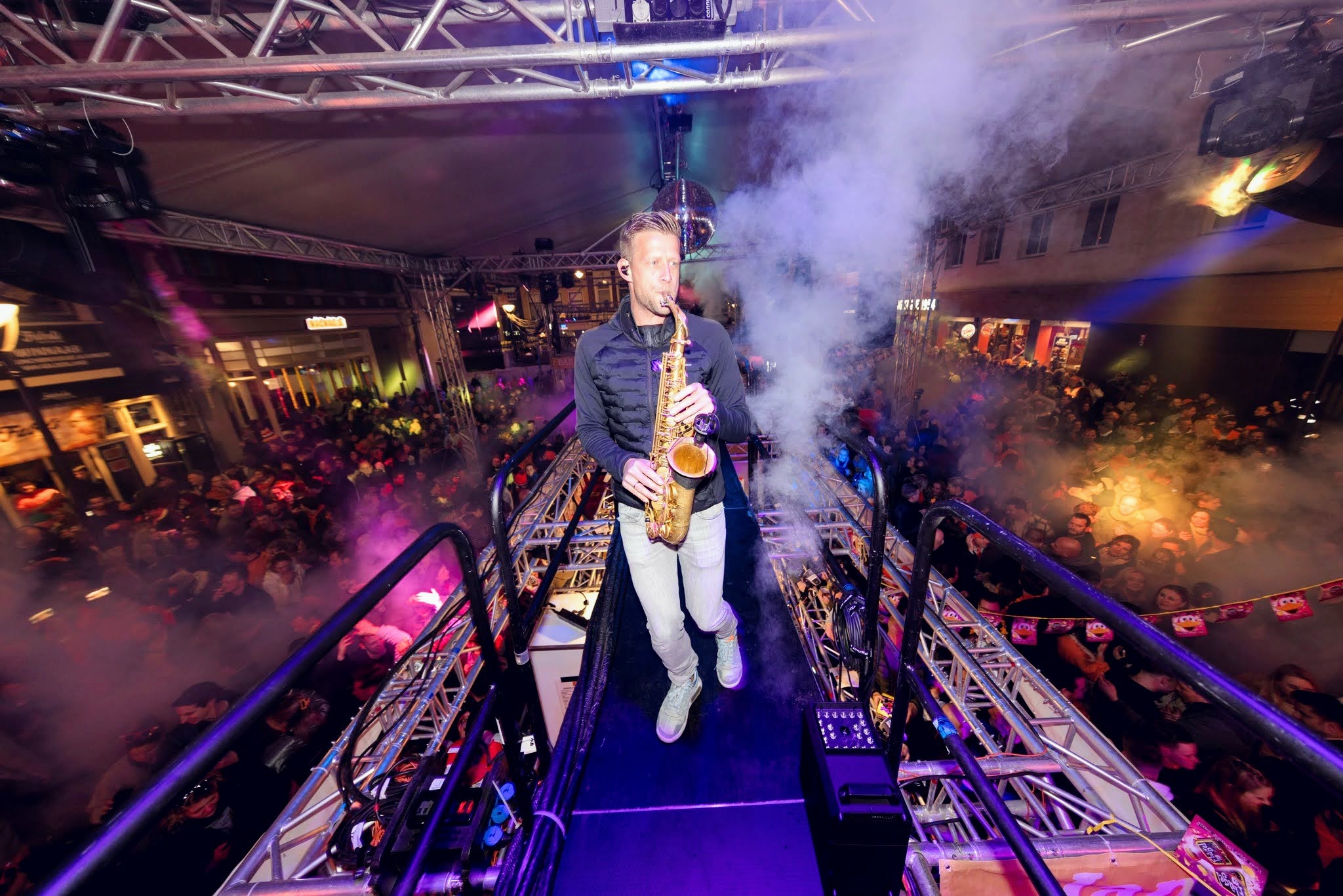Met strakke house-sets, funky live sax en veel interactie met het publiek brengen we ieder feest, festival of event naar het next level. Onze show is geen avondvullend programma, maar een knallende act van ongeveer een uur die gegarandeerd de dansvloer op z’n kop zet.